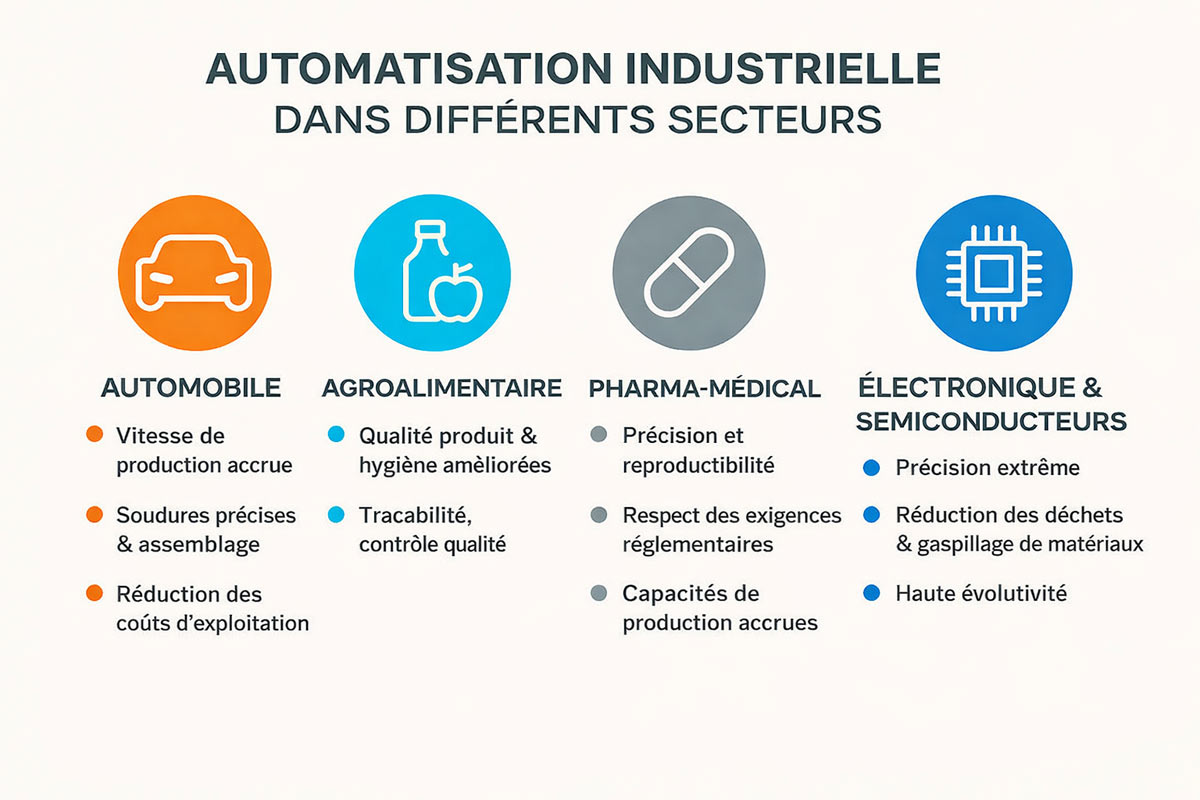 L’infographie présente quatre secteurs clés dans lesquels les technologies d’automatisation peuvent apporter des avantages particulièrement importants, avec trois exemples concrets par secteur.